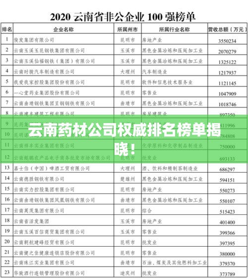 云南,這片充滿神奇與活力的土地,不僅擁有得天獨(dú)厚的自然資源和美麗的風(fēng)景名勝,更是中醫(yī)藥材的寶庫(kù),云南的藥材公司在國(guó)內(nèi)外享有很高的聲譽(yù),它們以其優(yōu)質(zhì)的產(chǎn)品、專(zhuān)業(yè)的服務(wù)和良好的市場(chǎng)口碑贏得了廣大客戶的信賴,我們將為您揭曉云南藥材公司的排名。