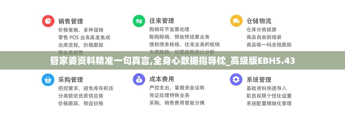 在當今數據驅動的時代,準確及時的商業信息對企業的成功至關重要。“管家婆資料精準一句真言,全身心數據指導枕_高級版EBH5.43”是一款旨在提高企業管理效率的軟件工具。通過整合豐富的數據資源,用戶可以快速獲取所需的商業信息,從而做出更為精準的決策。本文將深入探討這一軟件的特點及其如何幫助提升企業的運營效率。