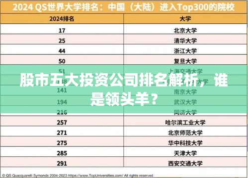 股市作為金融市場的重要組成部分,一直是投資者關(guān)注的焦點,隨著全球經(jīng)濟的不斷發(fā)展,股市中的投資公司也在不斷變化和壯大,本文將介紹當前股市中五大投資公司的排名情況,以期對投資者提供一些參考。