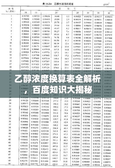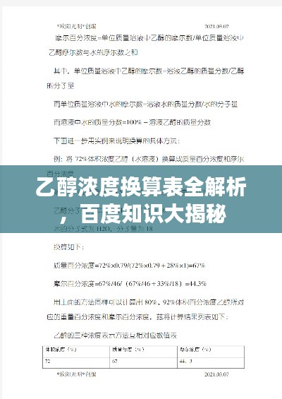 在化學(xué)、醫(yī)療、工業(yè)等領(lǐng)域,乙醇濃度的準(zhǔn)確換算至關(guān)重要,乙醇濃度換算表能夠幫助我們快速完成不同濃度乙醇之間的轉(zhuǎn)換,提高工作效率,隨著互聯(lián)網(wǎng)的普及,我們可以在百度等搜索引擎上輕松找到乙醇濃度換算表。