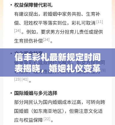 隨著社會的進步和人們觀念的開放,關于彩禮的傳統習俗也在逐漸發生變化,在信豐縣,彩禮作為婚姻嫁娶過程中的重要環節,其最新規定時間表反映了當地對于婚姻習俗的現代化改革趨勢,以下是對信豐彩禮最新規定時間表的詳細介紹。